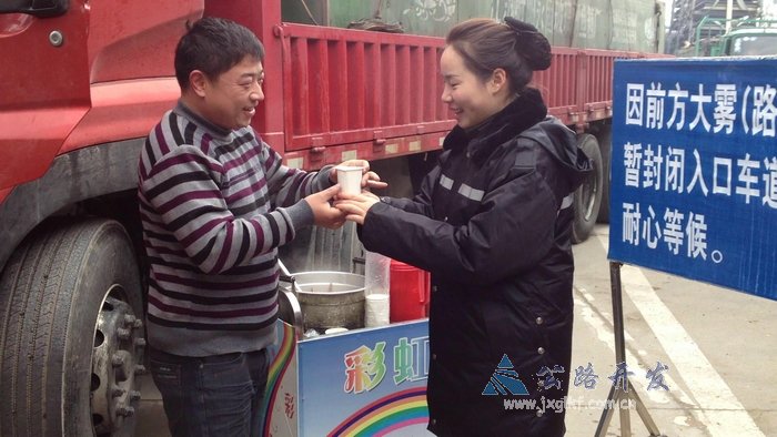 期间,梨温高速各收费站收费车道电子显示屏不断播放道路安全信息,加派人员,分赴各岗位,全力做好大雾期间的便民服务工作,为车辆的安全行驶做好了后勤保障服务。在鹰潭西收费站广场,收费站摆放了道路安全温馨提示标语。彩虹号便民服务车上还增加了暖壶、一次性水杯、茶叶、报纸刊物等便民服务物品。收费站的姑娘们多次给滞留车辆司机送去热开水,并微笑着对司乘朋友做好文明解释工作,让广大司机乘客朋友耐心等候。