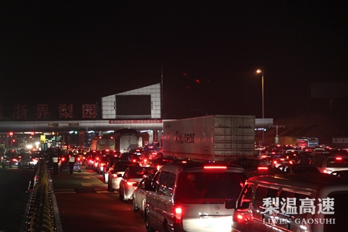 大年初九10至17时,梨温高速赣浙处梨园收费站每小时每车道高峰车流达240余辆,平均每15秒通过一辆车。该站启动14个复式便携式收费,包括向浙江收费处借用一个车道共32个车道同时收费。含行政人员共121余工作人员同时在收费岗位轮值。现场巨大的汽车轰鸣声,将收费广场变成一个大型工厂,收费员在“生产线上”忙个不停,车辆如“产品”一样有序下线。