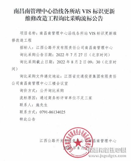 南昌南管理中心沿线各所站VIS标识更新维修改造工程询比采购流标公告