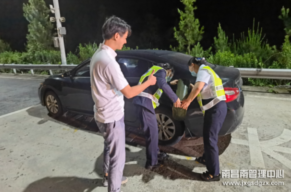 据悉,当天晚上9时50左右,一辆粤E牌照小车行驶至南昌南管理中心杜市收费站出口时燃油耗尽,车子无法发动,该车主急匆匆地从收费广场跑到岗亭寻求帮助:“你好,我车子的油箱报警灯已经闪了很久,车子现在没有办法正常启动了,你们能帮帮忙吗?”当班班长了解情况后,立即向值班站长报告。
