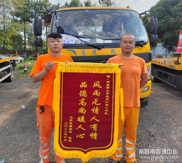 7月13日,余江中队收到了一面邮寄来的锦旗,上面写着“风雨无情人有情,品德高尚暖人心”。原来,在6月22日晚上20点30分,余江中队负责人张永义接到电话,一对母女在龙虎山服务区休息,正准备继续赶路前往广州时,车子突然无法启动,此时,天空正下着倾盆大雨,两人人生地不熟,着急地不知如何是好。