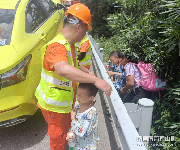 杨梅岭中队负责人李凯接到电话时,正好在K530附近巡逻,他立即驱车赶赴现场。抵达后,他先做好了后方安全围蔽,并组织车上所有人员到护栏外等待,谁知前车上有3个小朋友被吓坏了,其中一个5岁左右的小男孩哭得很厉害,拉着安全带硬是不肯下车。